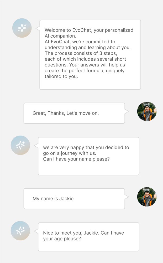 Before each shipment, you can chat with our EvoChat. This interaction helps refine and upgrade your formula, ensuring it continuously adapts to your evolving needs.